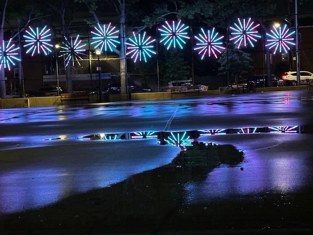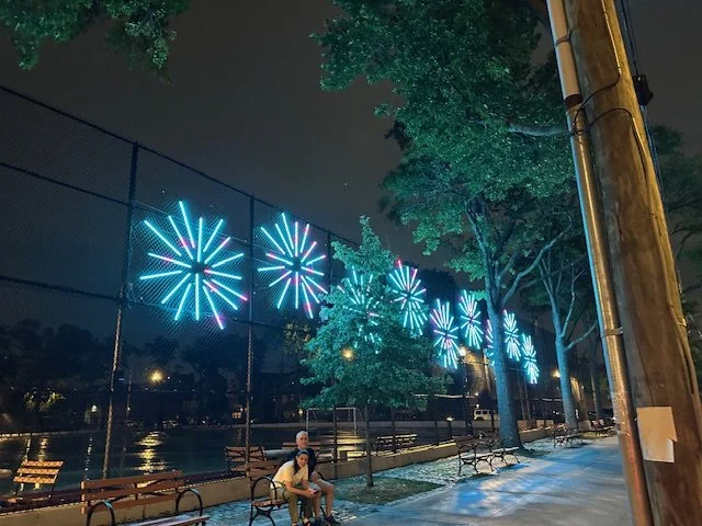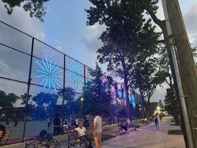 Morris Park, The Bronx – Following the success of our first award-winning light installation at Loreto Playground (“The Pulse, 2024-2025), the Morris Park Business Improvement District (MPBID) launched a new, large-scale public art lighting project on July 3rd 2025. The “Morris Park Stars” was shining brightly in red, white and blue for the July 4th holiday.